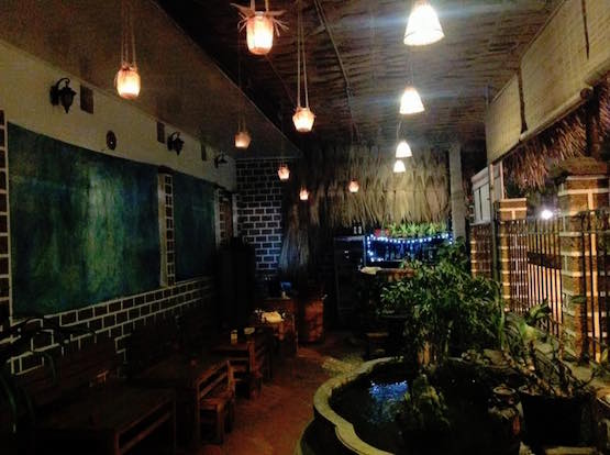 酒吧狹長的內部空間和茅草屋頂。