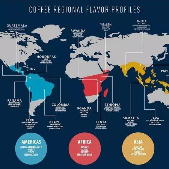 好了,現在讓我們來看一看世界上幾大主要產地咖啡的口味特征:
