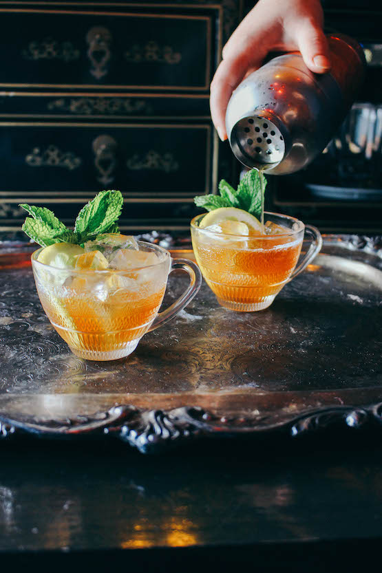 將所有原料放入英式搖酒壺,加入一小勺冰,輕輕搖和。倒入兩只加冰的茶杯。以檸檬圈和薄荷嫩枝裝飾。