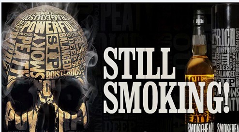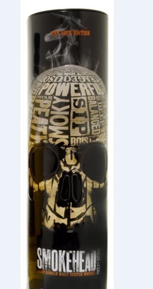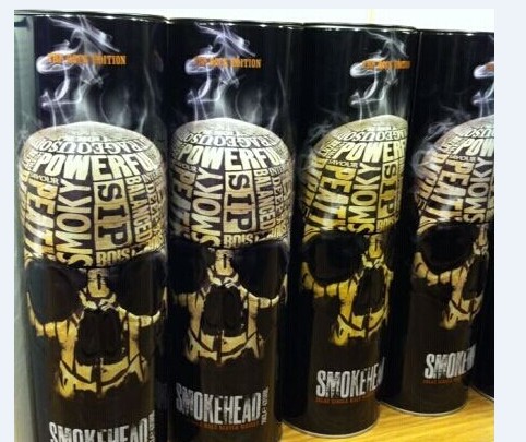 深黑色的酒罐上,以各種形容Smokehead威士忌風味的英文詞如peaty、smoky、powerful...組成一具骷髏頭。充滿十足的神秘感,更在視覺上帶來極其震撼的感覺,緊緊抓住了消費者的眼光