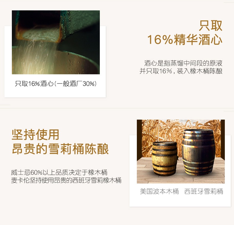 麥卡倫經(jīng)典雪莉桶系列,經(jīng)過了經(jīng)驗老道的手工制桶和雪莉酒潤陳,汲取了西班牙雪莉橡木桶充分的風味和復(fù)雜度,賦予其天然飽滿的色澤,豐厚優(yōu)雅的香氣,與干果、香辛料的特有口感,也充分傳遞了麥卡倫酒廠和調(diào)酒師對麥卡倫酒液質(zhì)量和風味的堅持。使得麥卡倫經(jīng)典雪莉桶系列成為蘇格蘭單一麥芽威士忌中的典范。
