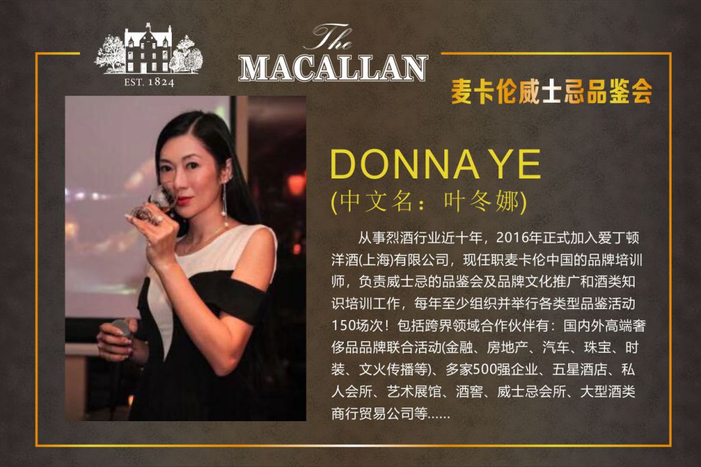 麥卡倫中國品牌培訓師 DONNA YE 葉冬娜 2016年加入愛丁頓洋酒集團。目前現(xiàn)任職麥卡倫中國的品牌培訓師,負責威士忌的品鑒會及品牌文化推廣和酒類知識培訓工作。