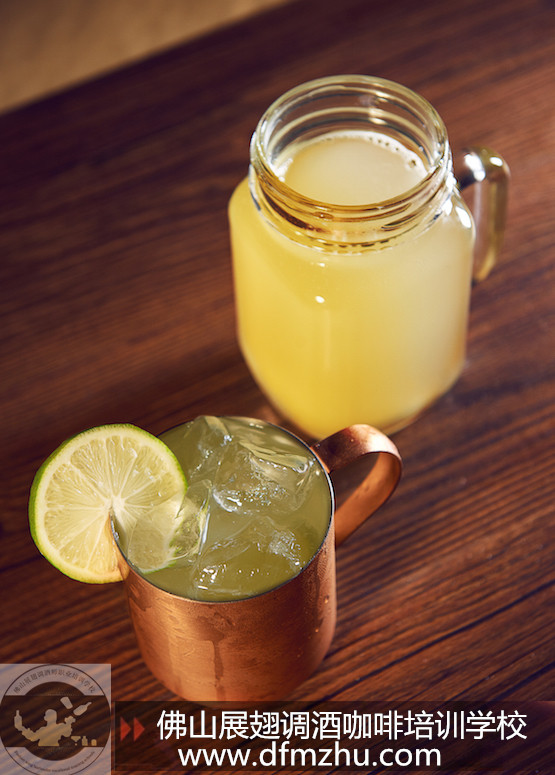 在銅質(zhì)馬克杯中調(diào)勻,以青檸裝飾。