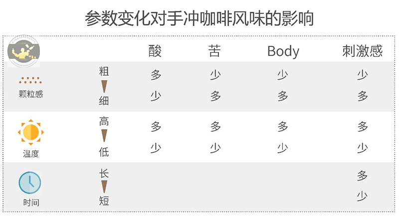 那么讓我們來看看各參數(shù)的變化如何影響一杯手沖咖啡的風(fēng)味吧: