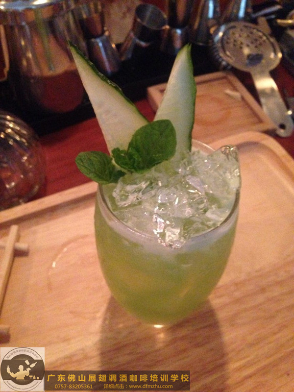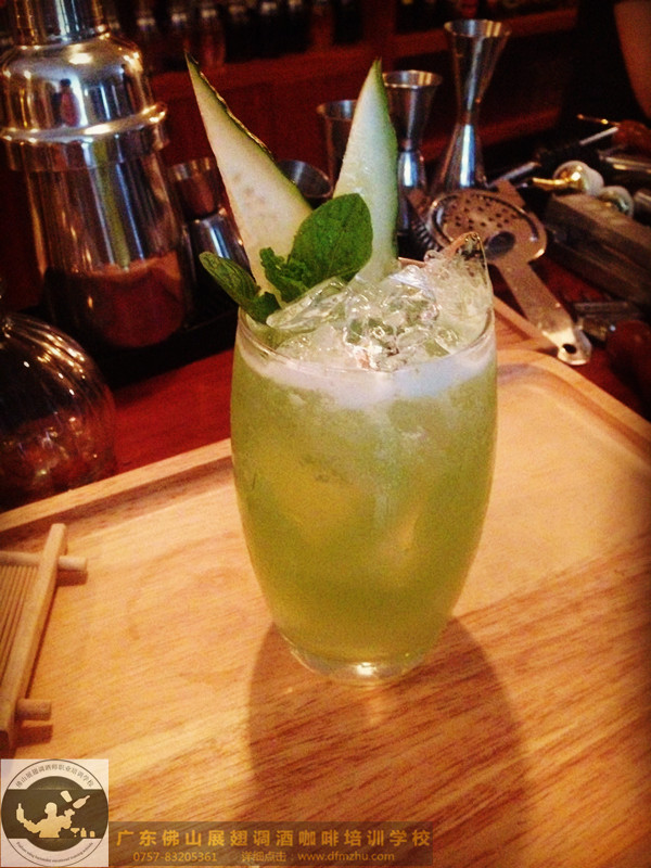 將所有原料加冰搖勻,然后濾入雞尾酒杯。用一枝小薄荷葉青瓜裝飾。